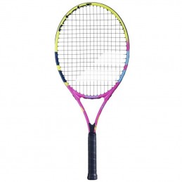 Babolat Rafa Nadal 25inc . Het blad heeft een grootte van 685 cm², waardoor het racket geschikt is voor jonge kinderen om tennis te leren spelen. Met het grotere blad is het vooral als beginnende speler makkelijker om de bal te raken. Het aluminium racket weegt 220 gram en heeft een lengte van 63,5 centimeter met het balanspunt op 31,5 centimeter. Het racket wordt aanbevolen voor kinderen vanaf 9 jaar. De Junior 25 nadal komt uit de collectie van Babolat en wordt bespannen geleverd.