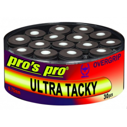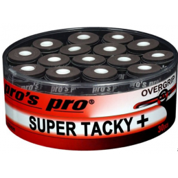 pros pro SUPER TACKY PLUS.De hoge kwaliteit van onze PROS PRO Overgrip is al vele jaren bekend bij spelers in heel Europa.Extreem plakkerig gevoel, uitstekende grip, zeer goede duurzaamheid,beste zweetabsorptie en hoog comfort kenmerken de uitstekende SUPER TACKY PLUS.Incl. afwerkingsband. Dikte: 0,5 mm.Kleur: zwart. Eén doos bevat 30 stuks