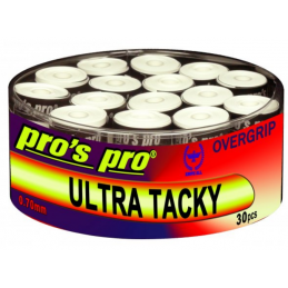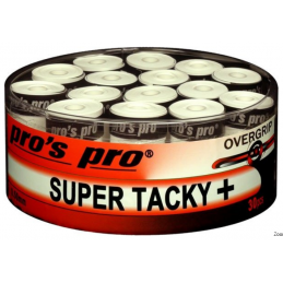 pros pro SUPER TACKY PLUS.De hoge kwaliteit van onze PROS PRO Overgrip is al vele jaren bekend bij spelers in heel Europa.Extreem plakkerig gevoel, uitstekende grip, zeer goede duurzaamheid,beste zweetabsorptie en hoog comfort kenmerken de uitstekende SUPER TACKY PLUS.Incl. afwerkingsband. Dikte: 0,5 mm.Kleur: wit. Eén doos bevat 30 stuks